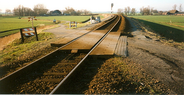 Foto gemaakt door Piet Niemeijer, jaren negentig. Mooi beeld van de oude spoorwegovergang. Verleden tijd… En de doorlopende Mokkenburgweg richting Datema-boerderij is binnenkort ook historie!