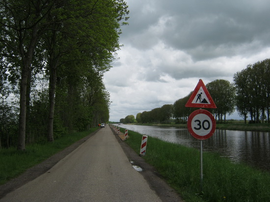 Langs het kanaal wordt duidelijk aangegeven dat er werk wordt verricht. Maximaal 30 km, wat een verademing als je hier langs loopt… (Al zijn er weinig chauffeurs die blijkbaar weten wat maximaal 30 km is….)