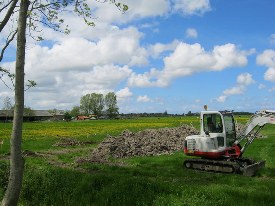 Deze graafmachine zal de komende week ongetwijfeld gezelschap krijgen van zwaardere familieleden. Anders waren, neem ik aan, de rijplaten niet langs de kanaalweg gelegd. (Al zal dat ook voor de aan en af rijdende vrachtauto’s zijn…)