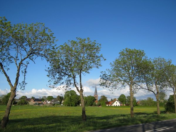 ’s Avonds loop ik nog even langs de westkant van het dorp via het N355-fietspad. De essen komen moeizaam in blad, het zicht op het dorp blijft een plaatje!