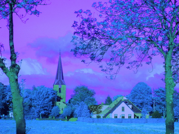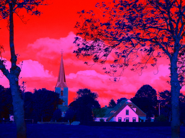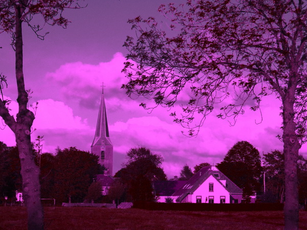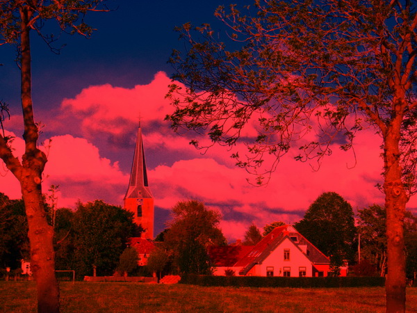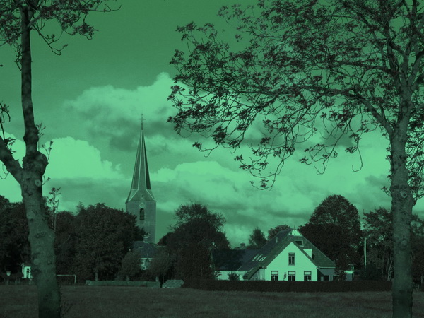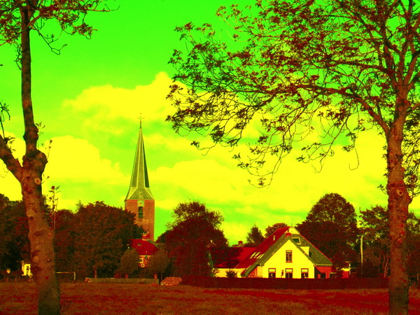 Fotobewerking, ik besteed er meestal niet veel tijd aan, al zijn de mogelijkheden langzamerhand legio. Mijn zwager Henk uit de Noordoostpolder stuurde me enkele bewerkte tulpenfoto’s. Kunstwerkjes, ze maakten me nieuwsgierig…. Ik koos een heel andere foto, het bekende aangezicht van Noordhorn-West, met kerktoren en de (bijna) witte gevel van huize Achterhof. Deze: