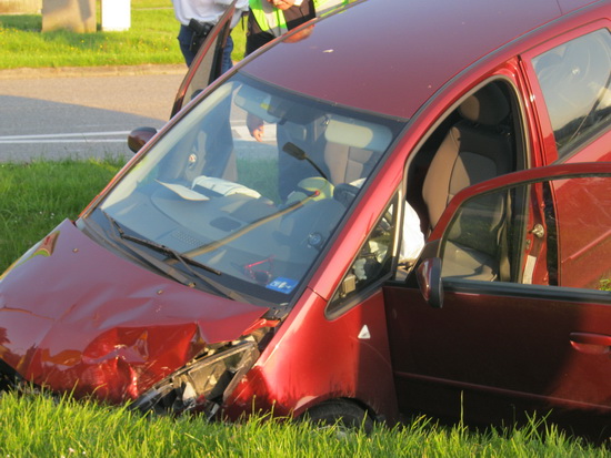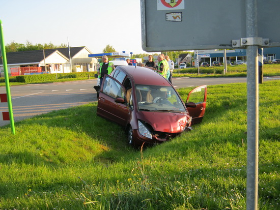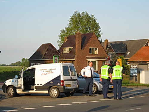 Even verderop was het een drukte van belang, bij de afslag van de Langestraat-Zuid naar de N355 of naar de overkant, de Industrieweg. Pal voor de te slopen woningen Langestraat 9 en 11 die deze keer louter als decors dienen…. Een ambulance aan de kant van de weg, enkele politie-auto’s, diverse Hermandad-dienaars, al of niet voorzien van opvallende hesjes, een personenauto flink beschadigd in de ondiepe sloot tussen weg en fietspad, en de bestelauto van houthandel Veenstra, rechtsvoor beschadigd, midden op de weg…. Dus allerminst verkeerscontrole tijdens de Avondvierdaagse…. De ambulance vloog niet met gillende sirene meteen terug naar de Stad, dat werkte geruststellend. Van enkele omstanders kreeg ik te horen dat de inzittenden van de auto in de sloot (moeder en schoolkind) in de ambulance zaten, maar dat ze niét heel ernstig gewond waren, gelukkig. Veenstra senior en junior zag ik lopen, dus die hadden zo te zien geen lichamelijk letsel van betekenis opgelopen. Nee, ongelukken zijn niet “mijn ding”. Als je er echter zó tegenaan loopt…. Enkele beelden: