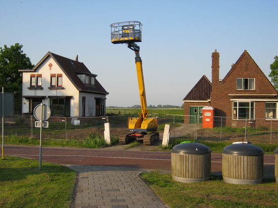 Een gestald rupsvoertuig met een bakje aan het eind van de beweegbare, uitschuifbare arm op de oprit van Langestraat 9 (voorheen Heemstra)