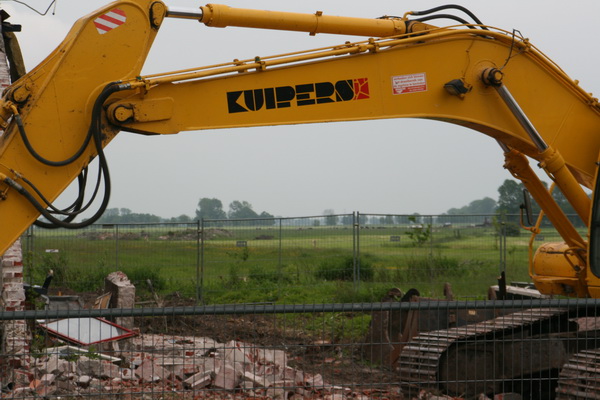 Het is vrijdagmiddag, het einde van de middag, als ik dit schrijf. Dan is Langestraat 11 plat…. Een zonnige sloopdag, waarop ik vele foto’s maakte, mede dankzij de geelgehelmde BORKmedewerker, die me in de loop van de middag uitnodigde om binnen het hekwerk te fotograferen. “Maar wel op de rijplaten blijven a.u.b.!” Dat deed ik, gezagsgetrouw als ik ben. Bovendien kreeg ik een schat aan informatie. Zo weet ik nu dat sloopbedrijf BORK (Stuifzand) ongeveer 70 jaar oud is en zo’n 100 vaste medewerkers heeft, als je het kantoorpersoneel meerekent. Op de kraan in Noordhorn staat weliswaar Kuipers-Steenwijk, maar dat familiebedrijf(je) bestaat eigenlijk niet meer, is opgegaan in BORK, inclusief het personeel. Deze kraan, een middelgrote, weegt 26 ton! (En er is een nieuwe in bestelling van 40 ton….) Het bedrijf doet heel veel zelf, zoals recycling en mechanisch onderhoud. Is het gesloopte materiaal echt nergens meer goed voor, dan wordt het afgevoerd naar de verbrandingsoven bij de Eemshaven. Bork heeft zelf 6 vrachtwagens en er rijden bijna 60 bedrijfswagens. Dat puin? Wordt hergebruikt, gemalen…. Voor de ondergrond bij aanleg van nieuwe wegen.