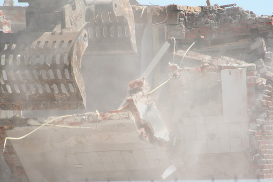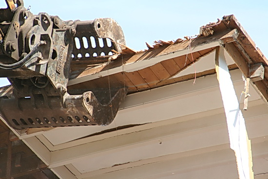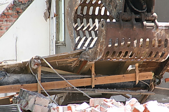 Het puntdak van Langestraat 9 is al afgebroken, als ik in de loop van de morgen aankom bij de sloopplek. De verse machinist zet er vaart achter….