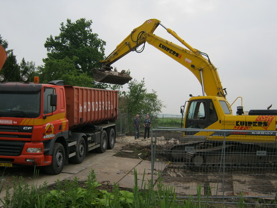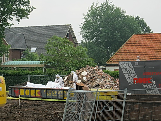 Niet alleen het opvallend zomerse weer zo tegen de langste dag (met flitsende en knallende effecten…), maar ook de sloop van twee panden aan de Langestraat Zuid zorgt voor een verrassend verloop. Leek het er gisteren lange tijd op dat het wegwerken van Langestraat 9 en 11 probleemloos zou worden afgerond, bleek het sloopgebeuren toch nog een onprettige beëindiging te herbergen. Op de valreep meldde de kraanbestuurder een hernieuwde asbestvondst. Kon het specialistenteam alsnog komen opdraven, vandaag, donderdag 20 juni 2013. Wellicht dat de regenval van deze late woensdagmiddag een verfrissend effect heeft… Het puin van Langestraat 11 kon in ieder geval worden afgevoerd. Langestraat 9 stelt zich dus toch nog te weer, al is en blijft het een achterhoedegevecht. Vanaf de volgende week worden er nieuwe hoofdstukken geschreven van het N355-verleggingverhaal.