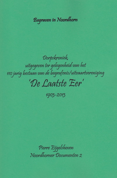 Vertraagde reactie, het kloeke boekwerk is al een poosje uit: “Begraven in Noordhorn” met als ondertitel: ‘Dorpskroniek uitgegeven ter gelegenheid van het 110-jarig bestaan van de begrafenis/uitvaartvereniging “De Laatste Eer’ 1903-2013′. Een hele mondvol, maar dan heb je ook wat in handen!