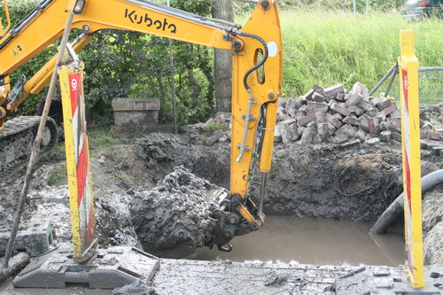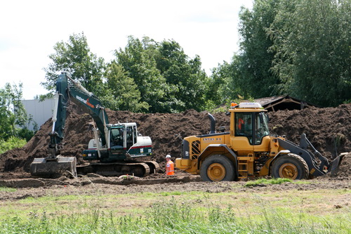 Bij een (boor)gat aan de parallelweg wordt bagger verwijderd. Het doet me denken aan het kikkerbad in het vroegere zwembad van Eexta….