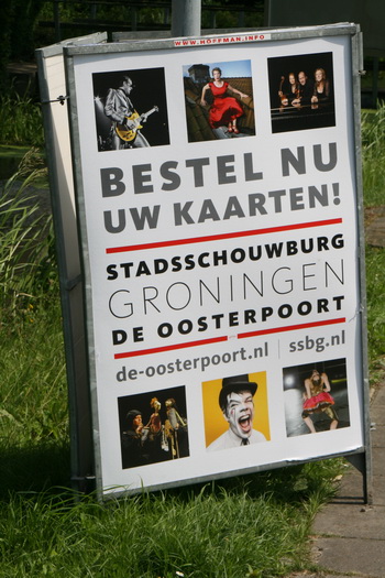 De reclame rond een lantaarnpaal ter plekke voelt als een vreemd element… Bovendien: Wie gaat er nu naar de schouwburg als er op je drempel zoveel enerverends staat te gebeuren?