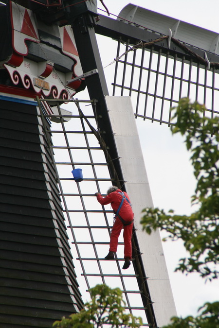 Op weg naar de GMB-activiteiten op rotonde- en tunnelterrein valt mijn oog op Drewe Schouten, de vrijwillige Fortuna-molenaar. Bezig met wiekenonderhoud. Enge plek… Alleen de gedachte daaraan geeft me al trillende benen…