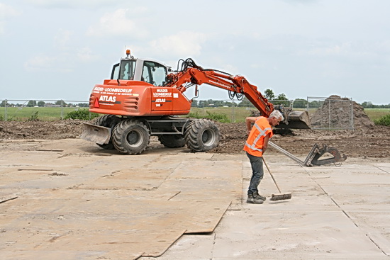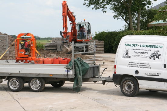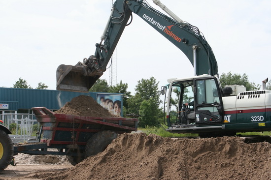 Op het rotondeterrein wordt grond verplaatsen tot een ware kunst verheven. Er liggen metershoge bulten grond, maar dat is blijkbaar niet geschikt als ondergrond voor de nieuwe weg. Daarvoor wordt andere grond aangevoerd en snel en efficiënt op de goede plaats gekieperd.