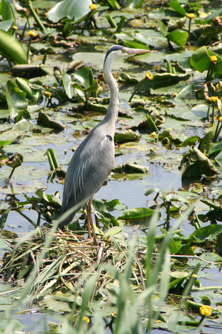 Even verderop is de al twee keer opgevlogen reiger neergestreken in het dotterbloemengebied. Waakzaam afwachtend wat de kieker gaat doen….