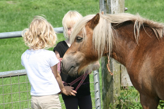 Drie jeugdige ponyverzorgsters proberen de grootste van de twee pony’s ervan te overtuigen dat zijn hoofd toch echt door het tuigje moet….