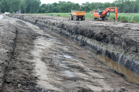 Op de voorgrond nieuwe grond om de toekomstige kanaaloever te versterken; op de achtergrond wordt grond afgegraven ter verbreding van het Van Starkenborghkanaal