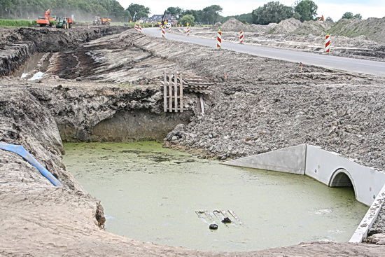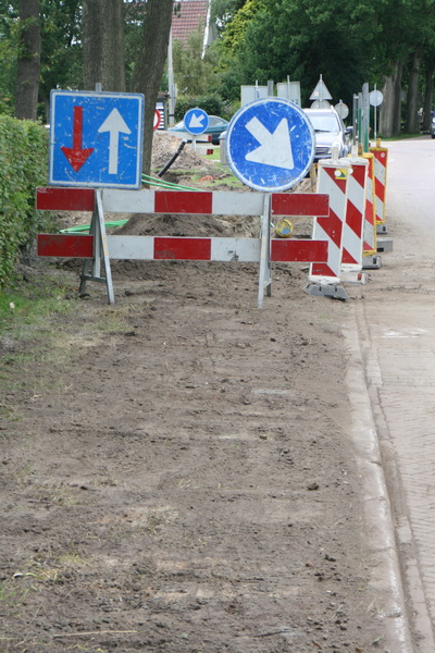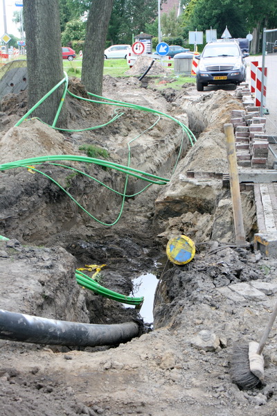 Bij de parallelweg aan de oostkant van de N355, vanaf de verkeersbrug gerekend, is een deel van de sleuven voor de kabels al weer keurig dicht gemaakt.