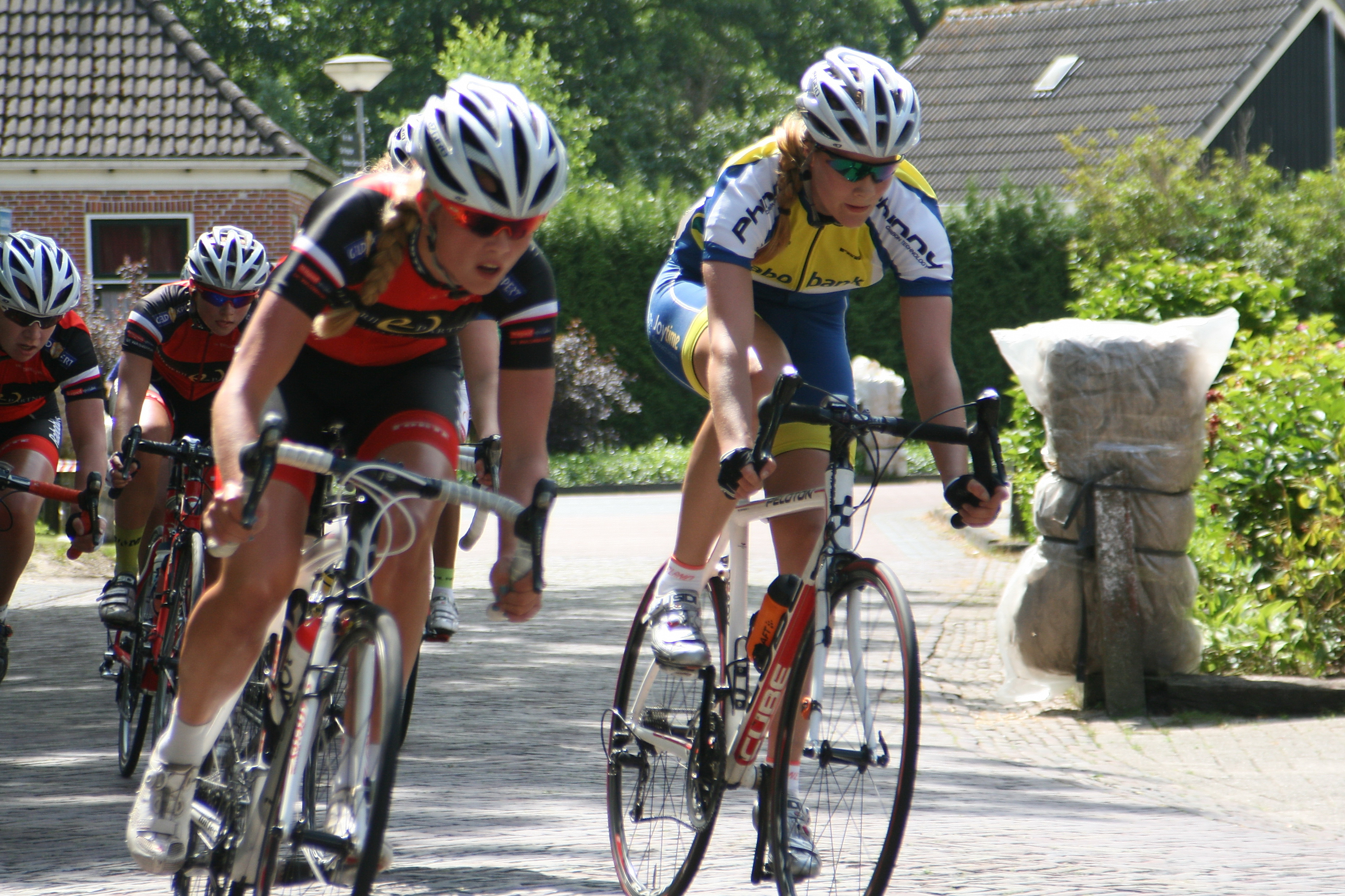 Heeft deze rijdster een 4D-bril op? Rijdt ze nog fantastischer rond dan ‘normaal’ in dit bijzondere dorp! Links de rijdster van Bike4Air, zo te zien gaat het pijn doen!