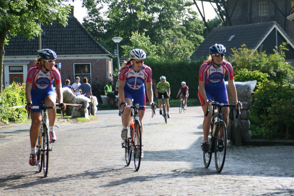 Al vroeg in de wedstrijd komt een drietal rensters op voorsprong: Daniëlle Lissenberg trekt door, Ivana Tiessens (Zuidhorn) werkt uitstekend mee (groen shirt). Wie de lady in het midden is? Vergeten….