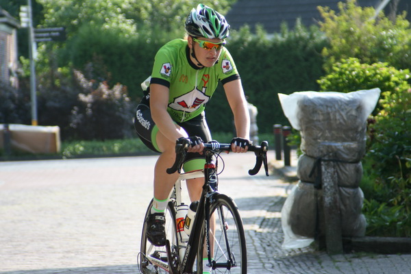 Scherp beeld van een in gedachten verzonken renster. Ivana Tiessens, het zich gestaag ontplooiende talent uit Zuidhorn? Nee, ook al draagt ze een groen shirt, een groentje is zij niet meer…..