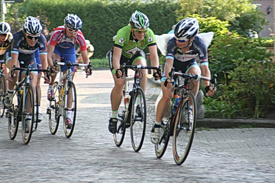 We pakken de draad weer op bij de Elite Vrouwen met dit groene ‘treintje’, de kleuren van de ploeg waartoe ook oud-winnares Janneke Ensing behoort. Hier gaat het nog goed, de bocht van Langestraat naar Oosterweg….