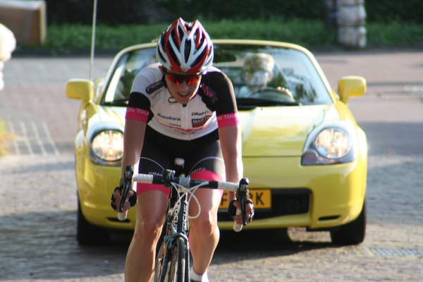 En hier frontaal in beeld Daniëlle Lissenberg-Bekkering, een van de smaakmakers van deze 60 km! Zij kreeg later niet voor niets de prijs voor de strijdlustigste renner!