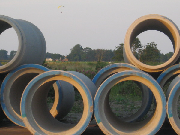 Mooi gezicht, forse buizen in de avondzon…. Zullen wel niet voor de riolering van de Noorderweg zijn bedoeld…