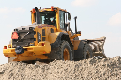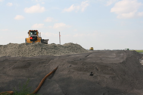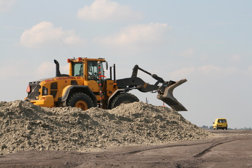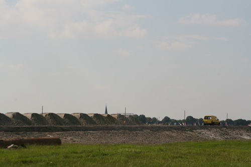 Hier kun je duidelijk zien dat er al heel wat ladingen zand naar het nieuwe wegtracé zijn gebracht. Er moet nog wel even een gladde laag van worden gemaakt…