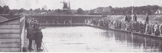 “Opening van het toenmalige zwembad, op 6 augustus 1930, door burgemeester G. de Vries (lange man op voorgrond, met bolhoed).”