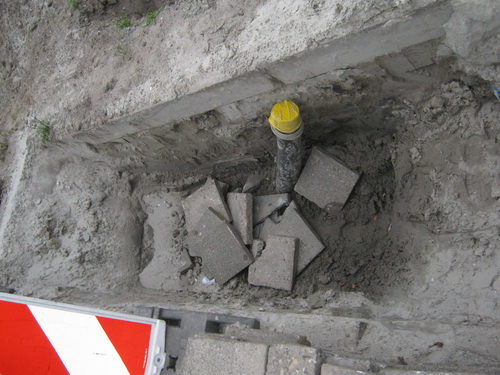 ….daarna nog even gekeken bij het kanaal. De grijper is weg; voor alle zekerheid blokkeren plaveiselbrokstukken de route richting spoorbrug.