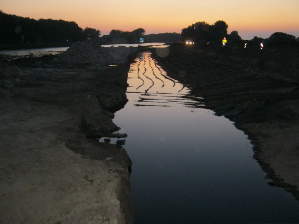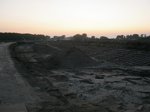 Eigenlijk al te donker voor het maken van landschapsfoto’s… De situatie bij de bochtverruiming, voorbij de spoorbrug. Er zijn reuzevorderingen gemaakt. Een gelukszoeker is met zijn metaaldetector in de avondschemer bezig iets van waarde uit de omgerommelde aarde te halen…