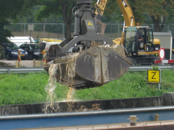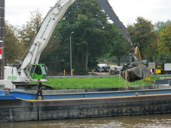 Het drijvende werkeiland aan de overkant van het kanaal bij de oude sportzaal aan de Westergast + een boot die de gebaggerde grond gaat afvoeren.
