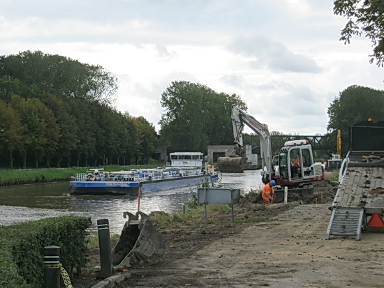 Even een adempauze voor Mulder & Co, even kijken naar de collega-kanaalwerkers aan de overkant…. Met de “Hendrik” wordt een smal, langgerekt drijvend “iets” naast de ponton met kraan gedirigeerd. Een smalle loopbrug, nee, geen catwalk voor mannequins… (Al zou het wel een unieke plek zijn voor een modeshow!)