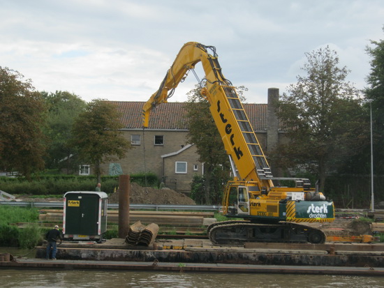 Ja, ik kijk mijn ogen uit! En iedere keer word ik weer naar het Van Starkenborghkanaal getrokken… De aantrekkingskracht van water, schepen, drijvende werkeilanden is groot! Even sta ik te kijken naar de werkers van loonbedrijf Mulder die aan de noordkant van het kanaal (waar de Industrieweg op de kanaalweg uitkomt, op de hoek bij Koopman) aan het graven en bekisten zijn…. Dat bekisten gebeurt straks ook op de bodem van het kanaal. Er worden twee wanden met tussenruimte aangebracht, onder water. (De binnenvaart moet ongestoord kunnen doorgaan, 24-uurseconomie!) Dan wordt die tussenruimte uitgebaggerd en daar wordt dan de verbindende gasleiding ingelegd tussen Noord- en Zuidhorn, een 15 meter oostelijker dan waar de huidige leiding verzonken ligt (Zie het gele bord aan de oever, met de Z erop). Daar de diepgang van de schepen steeds groter wordt, moet de gasleiding dieper komen te liggen om averij te voorkomen. Die verzinking van de gasleiding staat in oktober op het programma, wat er nu gebeurt zijn voorbereidingen. Die toebereidselen kun je tenminste met het blote oog waarnemen…. Wat straks onder water gebeurt, daarvoor zijn andere technieken nodig. Dus geen diepteboringen?? Nee, daarvoor ontbreekt ter plekke de ruimte…. (Had het parkeerterrein van Koopman moeten worden benut, geeft teveel rompslomp…) Zo, mijn hoofd zit eerst wel weer vol genoeg , het lichaamsdeel heeft nu eenmaal geen HTS-inhoud…: