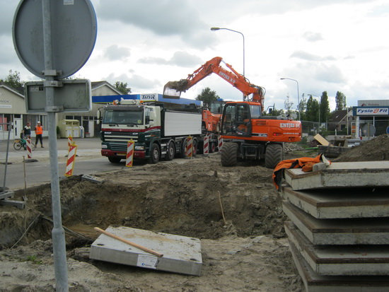 Uren kan ik wel naar dat kanaalwerk kijken, maar niet stilstaand… Zere benen… Aan de wandel maar weer! Op de hoek van de Industrieweg/N355 is ook imponerende arbeid, maar vooral de machinerie op de aanhanger maakt indruk…