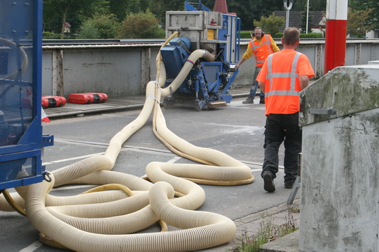 Links op de foto een ‘aanjager’ die waarschijnlijk lucht zuigt uit de lange slang. Een soort stofzuiger? Verhitter? Of is het niet zuigen, maar blazen???!
