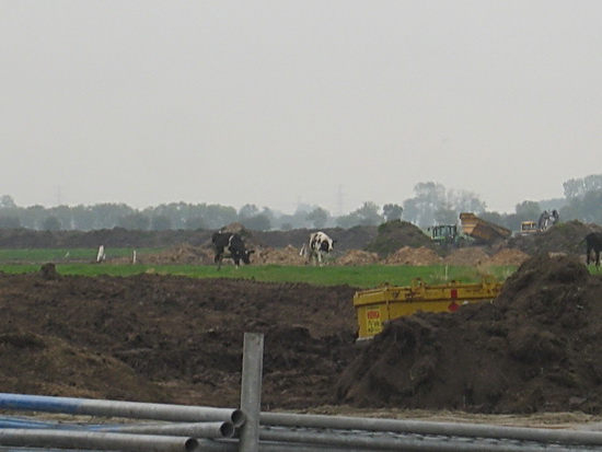 Als je zo vanaf de Langestraat Zuid over de lege plek van Langestraat 9 en 11 kijkt, zie je de wegverleggers oprukken, een onstuitbaar leger…. En de koeien grazen nog vredig tussen alle drukte….