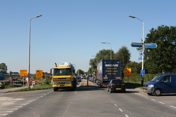 Filevorming op de N355 voor de verkeerslichten bij de nieuwe aansluiting van de omleidingsweg op de N355, ter hoogte van de molen “Fortuna”. Soms valt het mee…..