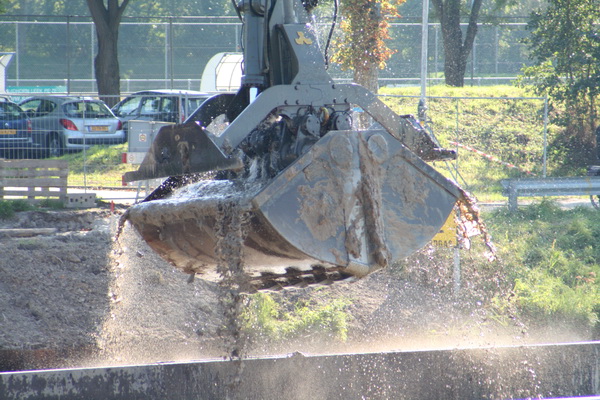Aan de zuidzijde van het kanaal wordt nog steeds hapsgewijs het ruim gevuld van de “Con Zelo” met een waterige massa. Zouden daarin nog wel eens waardevolle spullen worden aangetroffen?
