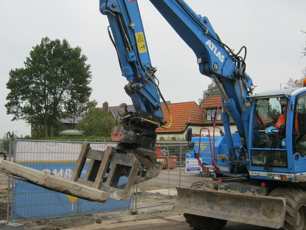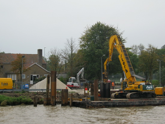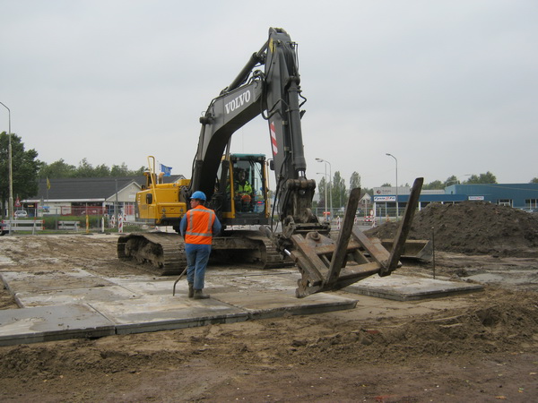 Een GMB-werker met blauwe helm en oranje hes + een kraanmachinist die betonnen platen aaneen schuift. Er wordt een omleidingsweg aangelegd, met spoed. Voor het verkeer vanuit Noordhorn. En de fietsers? Ook de fietsers…..