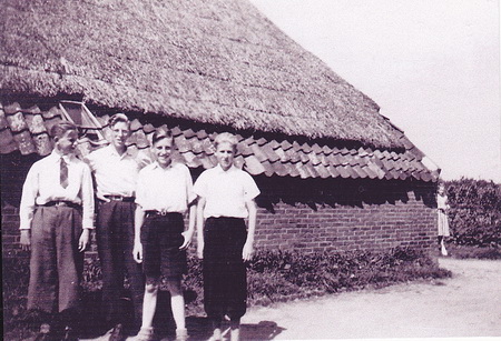 De foto is van na de oorlog, waarschijnlijk uit 1948. De plaats? Het huis van de familie K.Tempel op de hoek van de Noordwijkweg (toen nog een pad) en de Moeshorn (ook nog niet verhard). Let ook op het strodak! Links op de foto, opzij kijkend, een jonge Leendert Meijer, die als pleegkind opgroeide in het gezin van Veenstra die aan de oostkant van de Noordwijkweg woonde. (Veenstra “boerde” en was ook jarenlang koster van de Hervormde Kerk). Als tweede en derde van het groepje, vanaf links, de broers Loet en Arie Schelling. Zij zijn het die tijdens de oorlog in de zomerperiode te gast waren in het Veenstra-gezin. Nummer 4, de lichtblonde jongeman, is Berend Kazemier (die later trouwde met Korrie Beukema, maar al jong overleed, vader van René). Achter de schuur rechts staat de oudste dochter van de familie Tempel, Gea. Mocht er meer informatie beschikbaar zijn over de broers Schelling (of over andere kinderen die tijdens de bezetting te gast waren in Noordhorn), ik hou me aanbevolen!