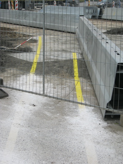 Hé, hier is een fietsstrook zichtbaar, langs de afbakening van de omleidingsweg voor het snelverkeer. Zo te zien een grillige route die ook nog eens die van het snelverkeer kruist. Stapvoets rijden, geen plek voor snelheidsduivels….