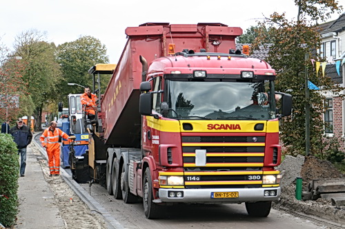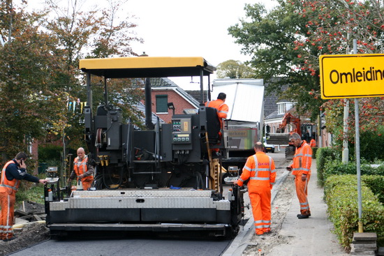 Door het gunstige oktoberweer was het vrijdag 18 oktober goed toeven langs de Noorderweg. Het gedeelte tussen Touwslagersbaan en Langestraat werd voorzien van een nieuwe asfaltlaag. (Koukleumen konden zich warmen aan de deklaag….) Aan weerskanten komen nog rijen klinkers en wordt de straat aldus voorzien van uitwijkmogelijkheden. (En de huizen krijgen volgens Dik van der Heide op verzoek gevelbeveiliging met terugstuiteigenschappen…). Hanna de Vries, op de hoek van Noorderweg en Langestraat, keek al bedenkelijk. “De straat wordt wel erg smal, als dat maar goed gaat met al dat brede vracht- en landbouwkerkeer…”