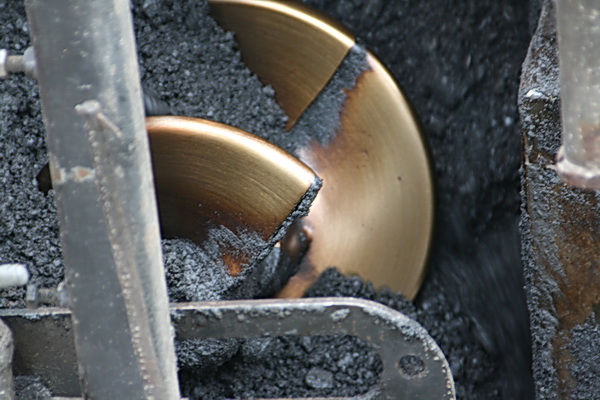 Een geweldige schroef draait het asfalt uit de voorraadbak naar de te beleggen weg. Mooi stukje techniek…. Of maalt ie ook??!
