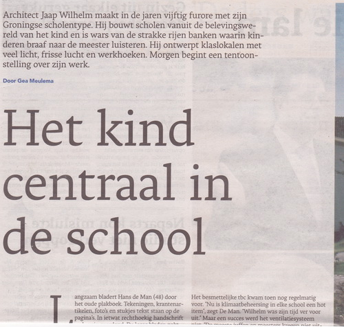 Gezien in Het Dagblad van het Noorden van donderdag 17 oktober jongstleden, een week geleden dus… Een uitgebreid artikel van Gea Meulema over twee pagina’s in de reeks “In het midden” met als kop: “Het kind centraal in de school“. Het gaat met name over architect Jaap Wilhelm die in de jaren vijftig bekendheid verwierf met zijn eigen(zinnig) schooltype, gebouwd vanuit de belevingswereld van het kind. Hoewel de school aan de Oosterweg in het artikel niet wordt genoemd, denk ik dat de vroegere O.L.S., in 1956 in gebruik genomen, wel degelijk “een Wilhelm-school” is! Klaslokalen met veel licht en lucht, een eigen ingang, werkhoek, toiletten…