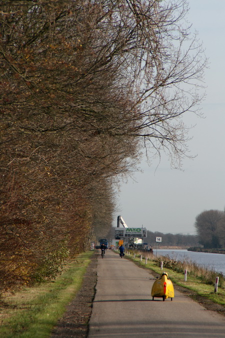 “Dat gele ding heet een velomobiel en is een driewielige ligfiets met aerodynamische buitenkant. Hierdoor zit je lekker warm en droog. Ik heb zelf namelijk ook zo’n ding (vanillegeel met rood/wit/blauwe strepen en nummer 53, lees: Herbie). Hier in de buurt wonen een paar andere mensen met een soortgelijk voertuig, maar ik vermoed dat deze persoon niet uit de buurt komt (aangezien hij niet wist of hij wel/niet door kon fietsen). Met een velomobiel kun je gemakkelijk langere afstanden overbruggen. Zo fiets ik over 1,5 week ‘even’ op en neer naar Lunteren. Een afstand van zo’n 170 kilometer. Prima te doen in ongeveer 7 tot 8 uurtjes.”