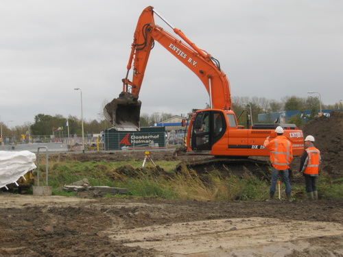 “De lans die jij bedoelt is een baken, daar staan getallen op. Door dit baken en de lancer (?) kun je de diepte berekenen, kwestie van goed afstellen. Wat moet er worden afgegraven? Wat moet er op hoogte worden gebracht? En als je meer wilt weten, vraag het de jongens van GMB of Oosterhof Holman!”