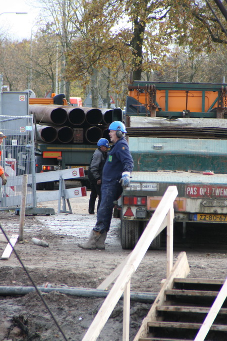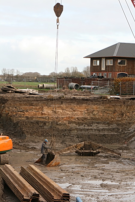 Bij de tunnelbouw aan de oostkant ging het vandaag vooral om leveringen door KNOL uit Akkrum (Veel Friese hulp bij de projecten in en bij Noordhorn!). IJzeren platen, balken, buizen…. Allemaal met de aanwezige kraan van de auto naar een plek in de tunnelkuip gehesen. Zonder bombarie, gewoon even je werk doen!