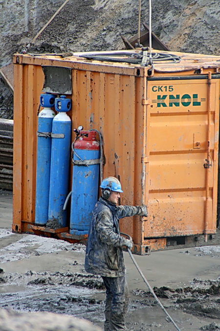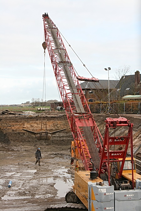 Ook de gereedschapskast moest even naar een andere plek en dan is zo’n kraan toch wel handig…. (Zou die tunnelwerker met de koptelefoon elke dag schone werkkleren tot zijn beschikking hebben? Hebben ze speciale wasmachines om de Noordhorner klei weg te spoelen?)