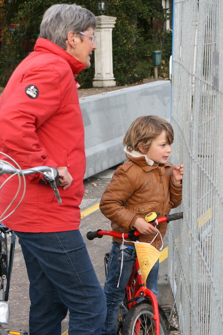 De hele dag, zeker als het mooi weer is, zijn er belangstellenden aan de rand van het tunnelterrein om de laatste ontwikkelingen met eigen ogen te aanschouwen. (Zo’n blogger kan je wel van alles op de mouw spelden of in scene zetten…) Hier oma en kleinzoon, leergierigheid troef!