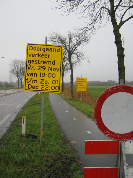 De komende stremming van de N355 vroegtijdig aangekondigd, goede zaak! Het fietspad is hier voor onbepaalde tijd afgesloten. Ben benieuwd hoe lang dat gaat duren…. Wandelend kun je er gauw langs, vooral op zo’n grijze zondag, wanneer er niet al te veel verkeersdrukte is en bovendien de brug tussen Noord- en Zuidhorn nog wel eens omhoog staat!