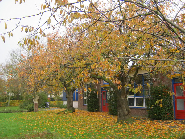 Bij de school aan de Oosterweg overheersen de herfstkleuren van de prunusbladeren. Het harmonieert uitstekend met de primaire kleuren op het schoolgebouw!